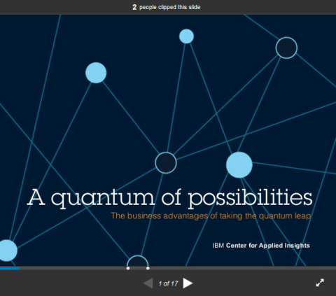 This gallery contains social graphics, infographics, videos, and a presentation related to the research, A quantum of possibilities: The business advantages of taking the quantum leap. Quantum computers promise exponential leaps in speed and power over what is attainable by traditional computers today. The IBM Center for Applied Insights, in partnership with IBM Research, interviewed experts in the quantum computing to learn about the latest breakthroughs in the field and the business benefit across applications and industries.