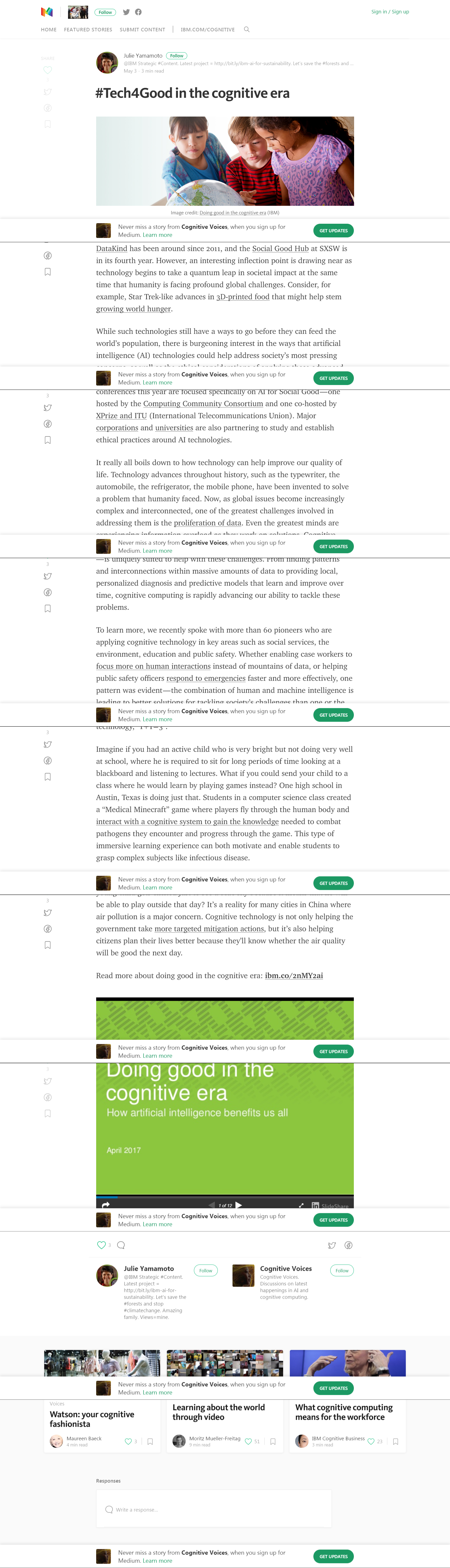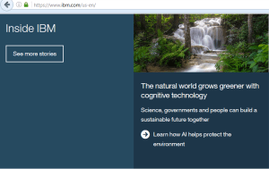 - Featured on the IBM home page twice as part of ongoing corporate messaging around cognitive computing capabilities for public good (for the main suite of articles and for the environment article)